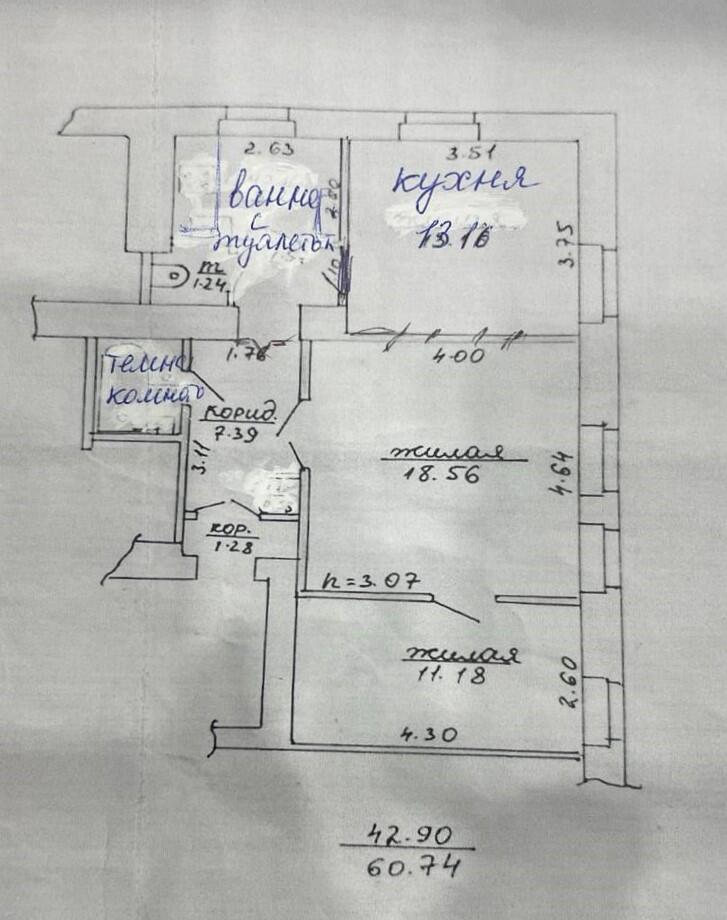 | Площадь общ/жил/кух | 60.74 / 29.74 / 13.13 кв.м. |